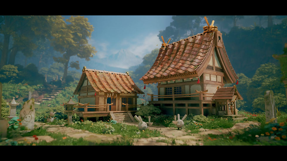 A lonely, but peaceful shrine dedicated to rabbit spirits sits in the middle of a forest clearing, overgrown by the surrounding foliage, and years untended to. Though it looks abandoned at a first glance, curious spirits still reside in the shrine and call it their home, curious whenever a rare traveler pays them a visit.